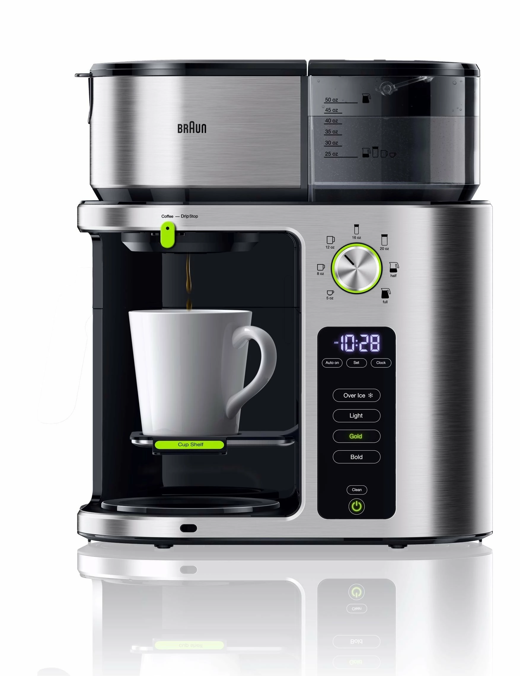 Enjoy a fresh, aromatic blend of hot or iced coffee with Braun’s MultiServe Coffee Machine! This evolutionary coffee maker is equipped with a range of smart functions, including Braun’s ExactBrew technology that automatically calculates the precise temperature, speed, and water flow for superior flavor and a velvety smooth texture. With BrewChoice Plus, you can customize your coffee for a light, gold, or bold strength, or choose iced coffee for a refreshing, never watered down cold brew!