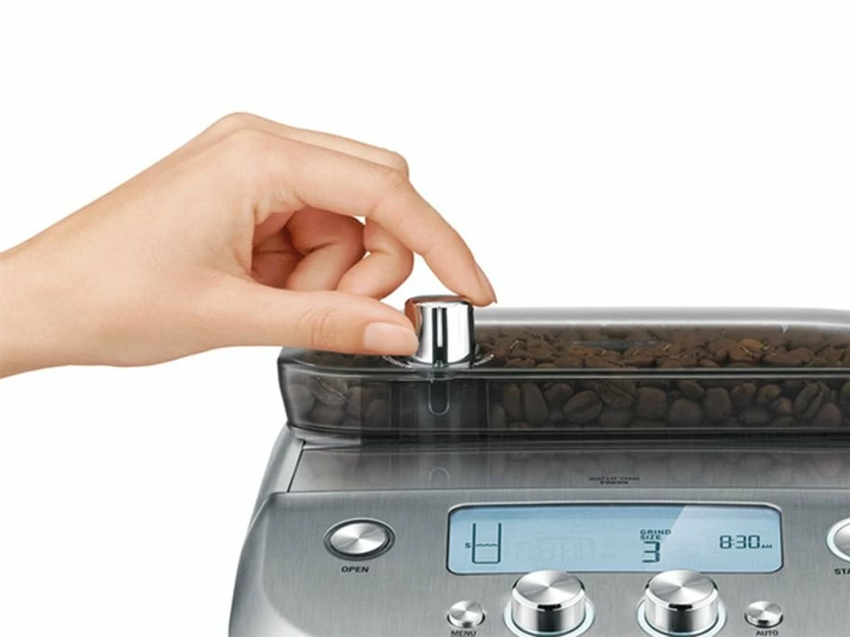 - Bean hopper contains locking mechanism to stop bean flow for transitioning new coffee beans
