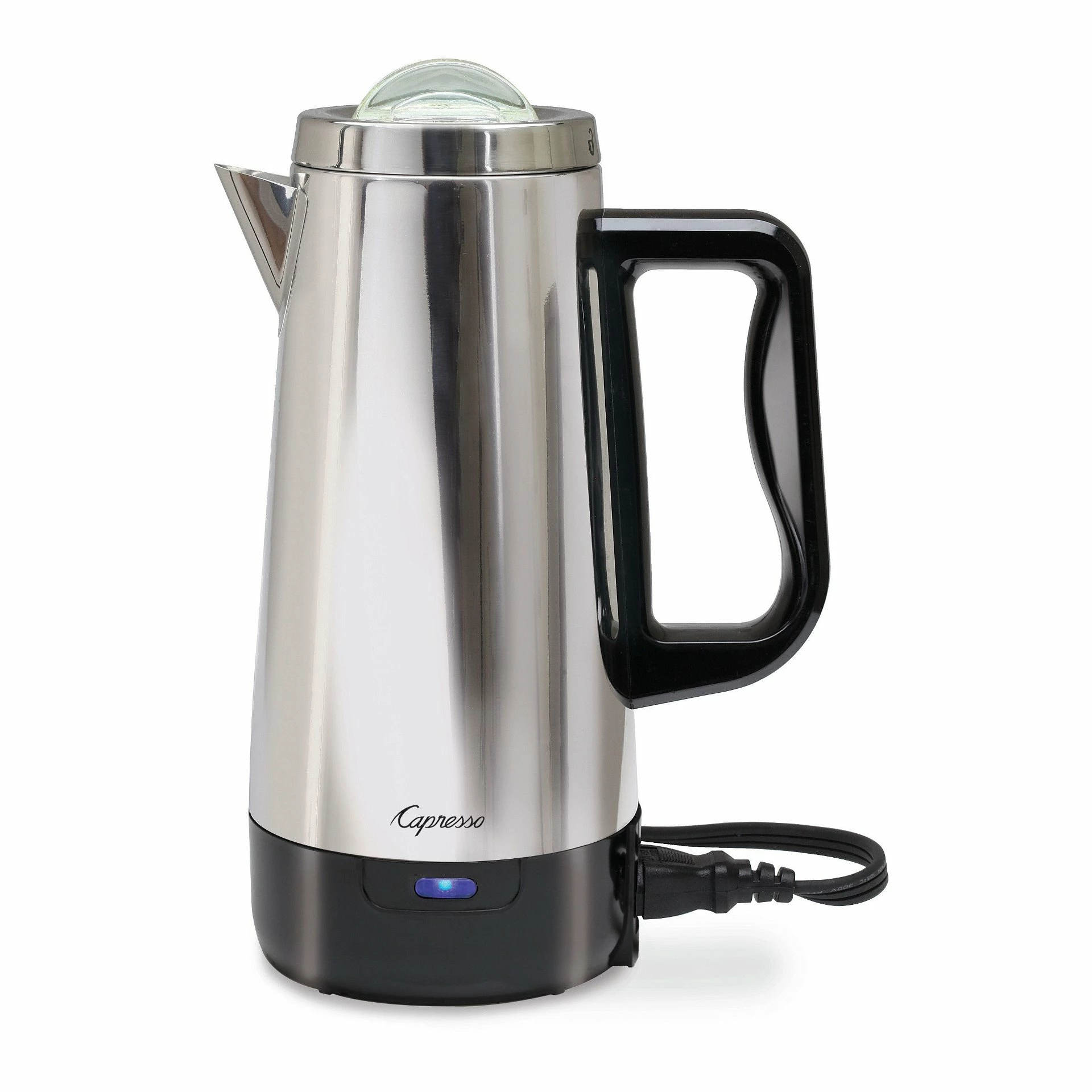 Enjoy a rich coffee blend without the cafe bill with Capresso’s Electric Coffee Perk! This contemporary design is modeled after the classic coffee percolator for easy use. Simply fill the elegant steel carafe with water and coffee, plug the unit in, and brew. With Capresso’s rapid-brew technology, this percolator can brew 12 cups of deliciously smooth coffee in less than 10 minutes. Capresso’s Stainless Steel Coffee Perk is ideal for parties, busy mornings, and office environments.Â