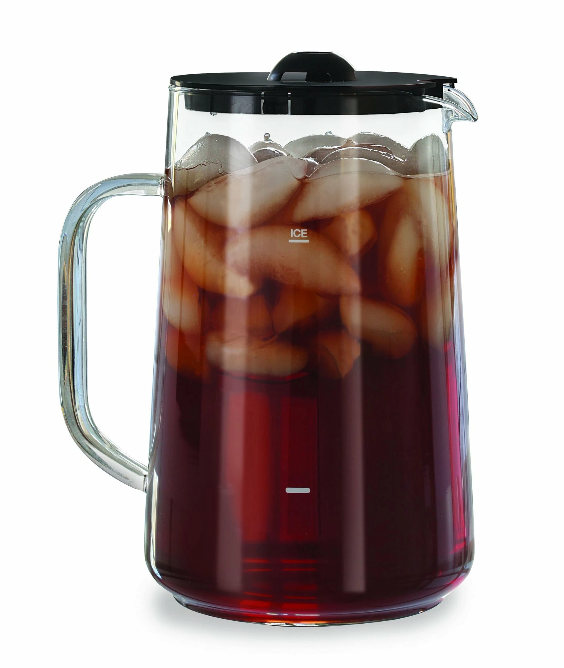 Iced teas in the summertime are so refreshing and perfect! The Capresso Iced Tea Maker makes the perfect carafe of luscious tea, any flavor or strength you want it to be, easily, and so beautifully. The permanent filter and removable filter basket holds both loose or bagged teas to brew a full 80 ounces of beverage. The tea maker machine has a flavor enhancer adjustment to alter brewing strengths from mild to strong, and an automatic shut-off when brewing is completed. A great, full-color recipe book is included to assist you in making gourmet teas with fresh or frozen fruits, herbs, mints, and more. Even use this iced tea maker to prepare a pot of rich iced coffee using automatic drip level grinds. The contemporary, clear glass brewing carafe will serve your teas in style, looking lovely on any table. A slim, contemporary body style in modern black and stainless will look beautiful on your counter-top. Make your favorite iced tea with this Capresso Iced Tea Maker, pull up a seat under the shade of a backyard tree. Sip, enjoy, relax, and cool yourself with your own blends of gourmet iced tea.