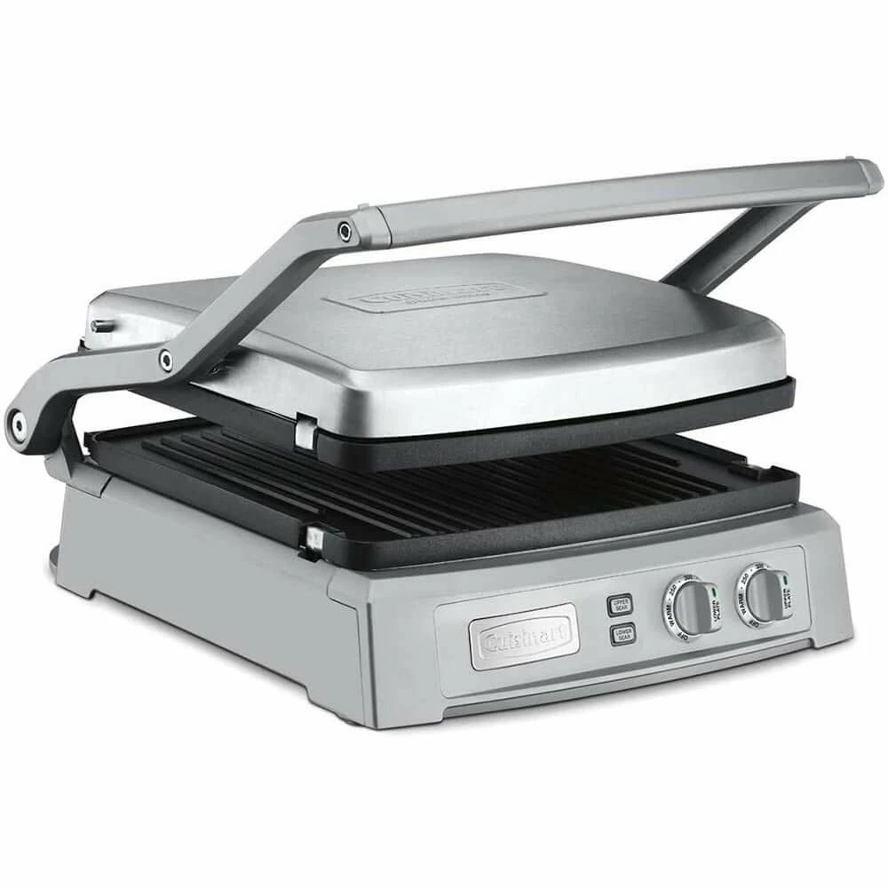 Expand your countertop grilling horizons with six cooking options and 240 square inches of grilling surface on the Cuisinart Griddler Deluxe! Reversible nonstick grill plates can be configured for contact grill, full griddle, full grill, panini press, half grill/griddle, and top melt cooking options. The sear function heats to 500°F for up to two minutes, allowing you to get great grill marks and searing on everything from burgers and steaks to vegetables and sandwiches. Dual-zone temperature controls harness 1800W of cooking power to let you cook foods at different temperatures at the same time. Juices and grease drain away from cooking food and into the integrated rear tray for easy collection. Red and green indicator lights display when the cooking surface is heated and ready for use, while the grill automatically shuts off after two hours as a safety precaution. The brushed stainless steel housing is easy to wipe clean and looks greatIncludes a dishwasher-safe cleaning/scraping tool and recipe/instruction booklet. Put the versatile Cuisinart Griddler Deluxe to work for any meal and enjoy everything from pancakes and sausage, to panini and melts, to burgers and steaks!
