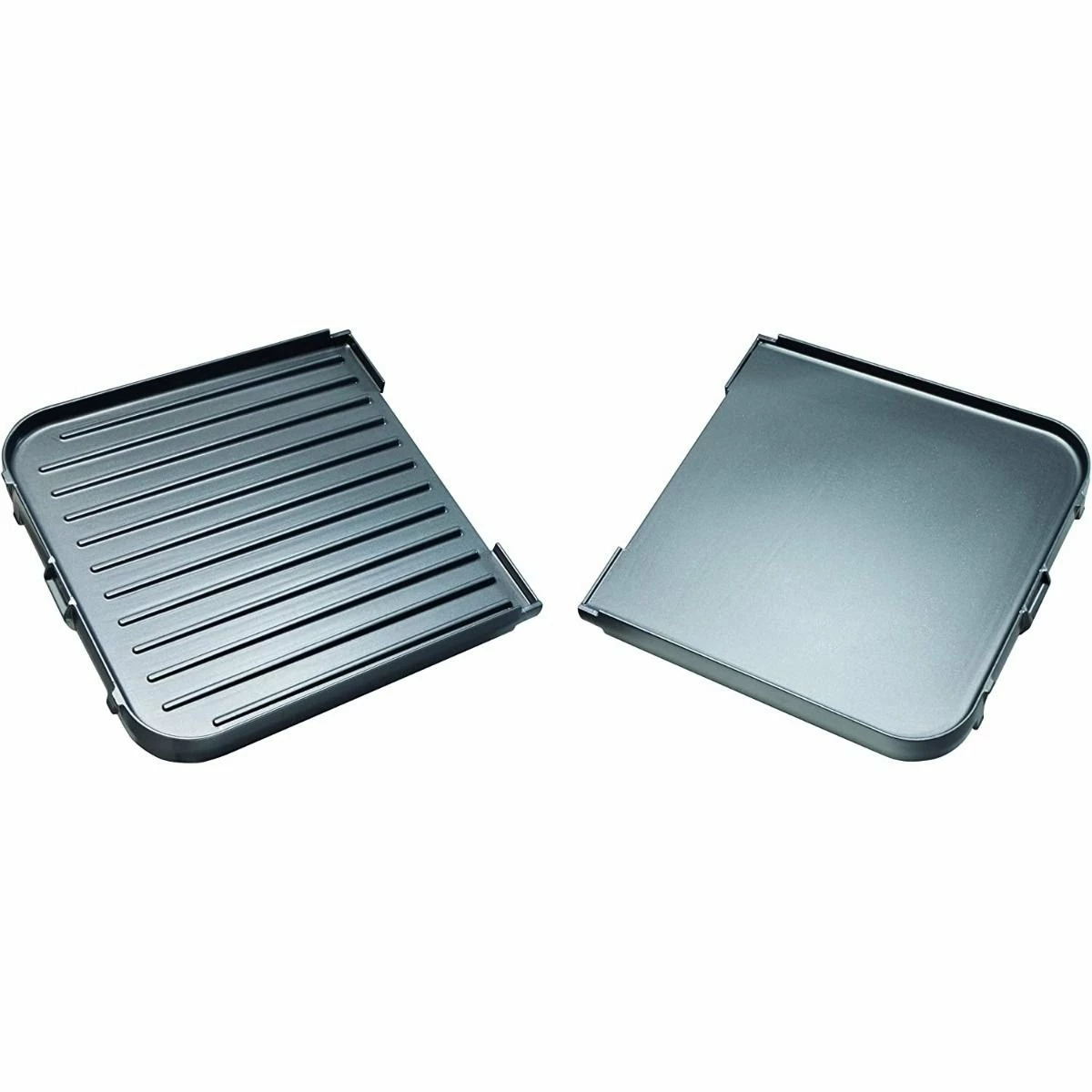 - One side features ridges for indoor grilling; the other side provides a flat surface