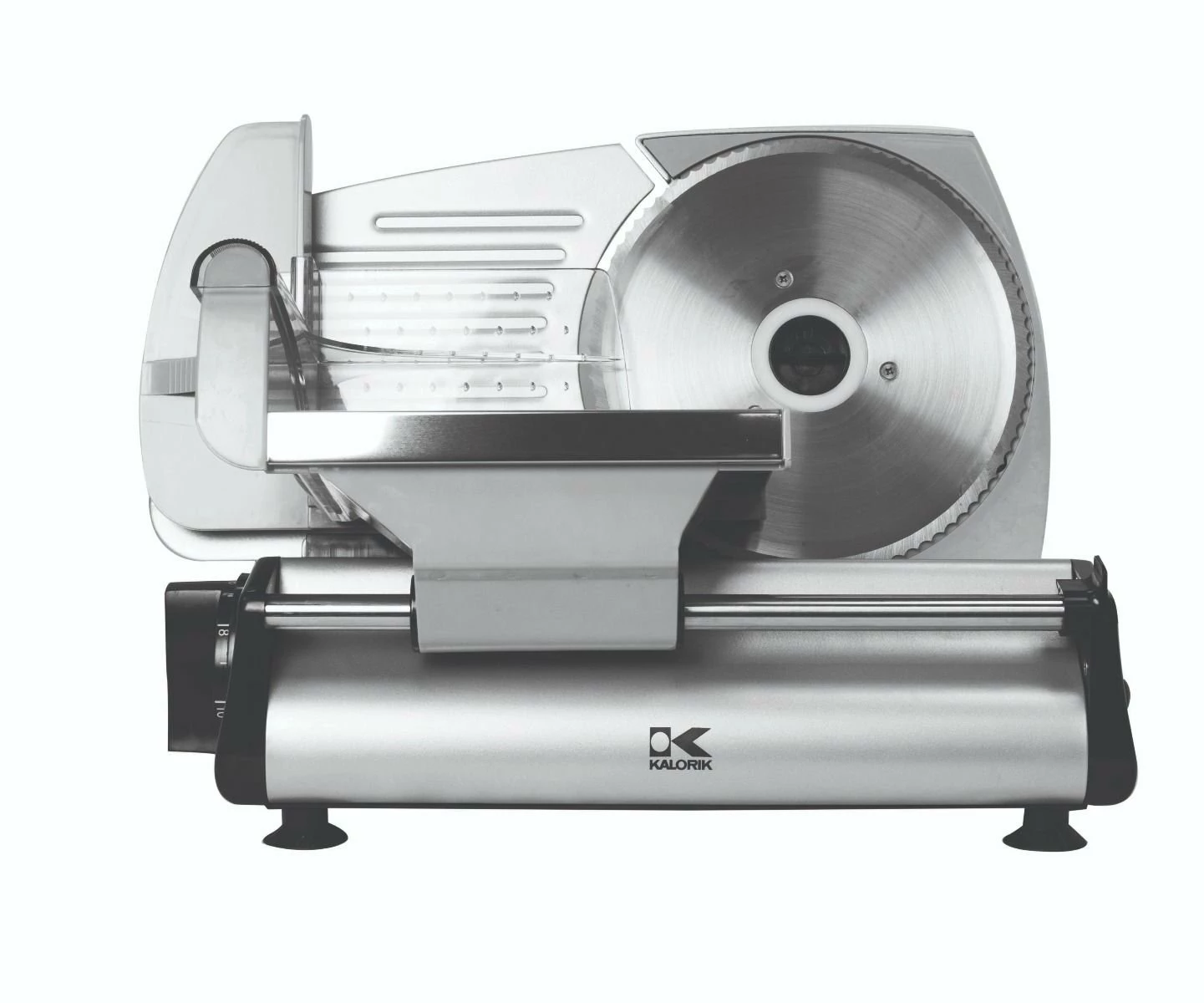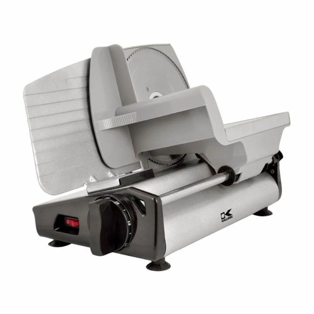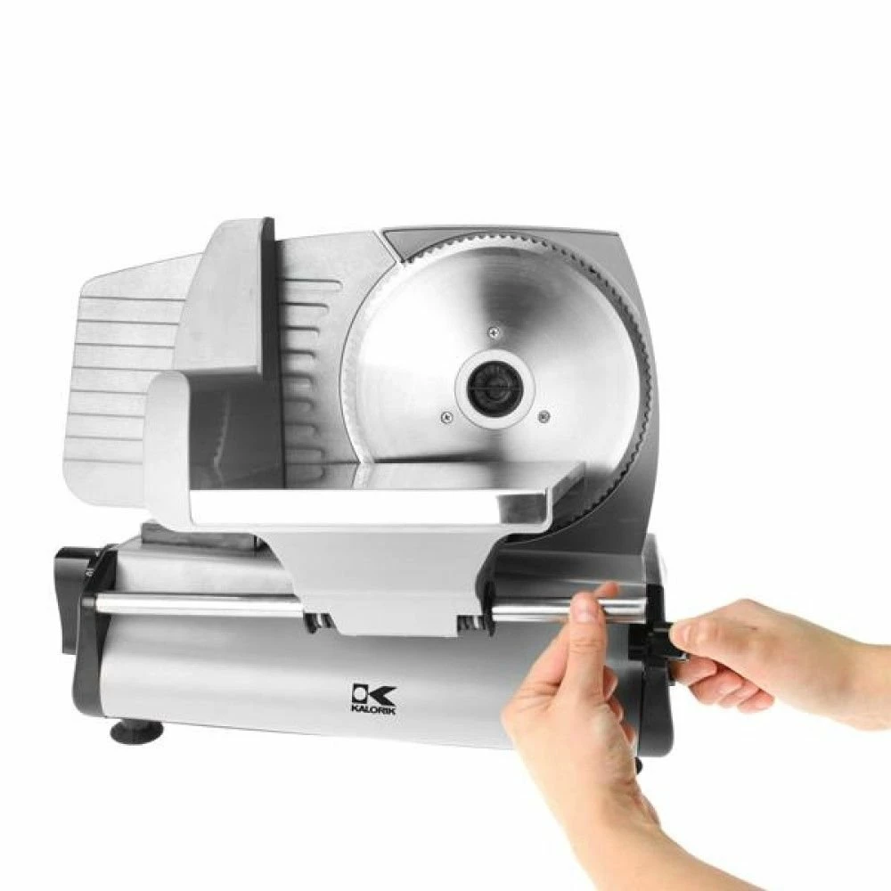 Tired of lunch meat sandwiches made with wet, pre-packaged meat? Slice up your own meat like a professional with the Kalorik Professional Style Food Slicer in Silver. This professional-style food slicer is a great way to stop buying pre-sliced meat, cheese, and veggies from the store. This slicer features a thumb guard and a specialized curved design so it will easily release slices as you use it, and deposit them to the side for easy organization. The slicer is designed with a precision thickness control knob, so you can cut ingredients as thick or as thin as you like. The blade is made from 7.5” serrated stainless steel and is easy to remove for deep cleaning. Enjoy fresher, healthier meat, cheese, and vegetables for your meals with ease, get the Kalorik Professional Style Food Slicer in Silver today!