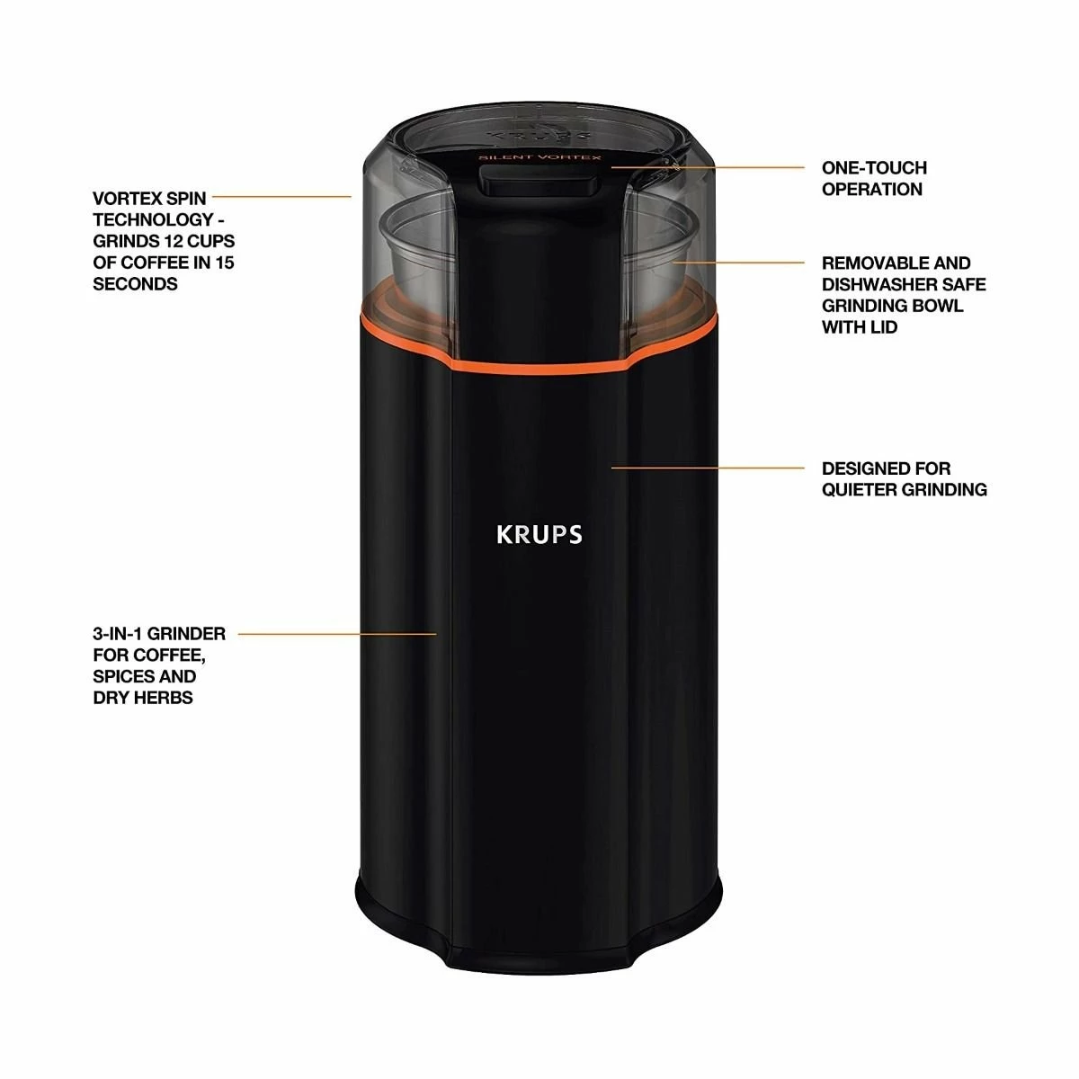KRUPS Silent Vortex 3-in-1 Coffee and Spice Grinder Features: