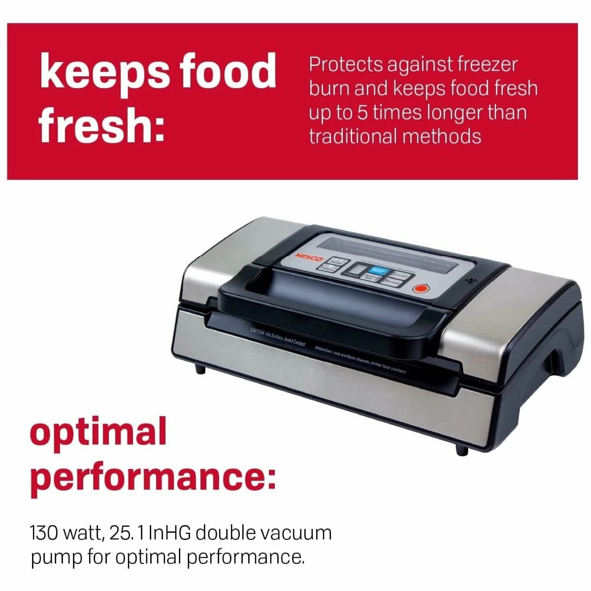 Vacuum sealing is an important process for preserving foods for longer and keeping them safe. When you must settle on a vacuum sealer for yourself, choose the Nesco Deluxe Vacuum Sealer! Made from plastic and stainless steel housing, this sealer delivers not just versatility, but it also grants the best performance. You may select from three settings—Dry, Moist, and Double—then choose either “Normal” or “Gentle” vacuum pressure to keep softer foods safe. When it comes to more delicate food items like pastries, bread, and sliced produce, try using the pulse vacuum function to control the suction power. Yet this 130-watt double vacuum pump also performs well with maximum air extraction when it comes to larger food items. It even has an optional double heat sealing feature for better security. Other features include an easy-lock handle for smooth sailing one-handed operation, a built-in bag cutter, and a roll storage compartment with a viewing window. The sealer itself accommodates up to 11.8″-wide bags, and each sealer comes with one 8.6″ x 9.85″ roll and one 11.8″ x 9.85″ roll. So don’t hold yourself back—get to sealing your food and keep them fresher for five times longer than traditional methods with the Nesco Deluxe Vacuum Sealer!