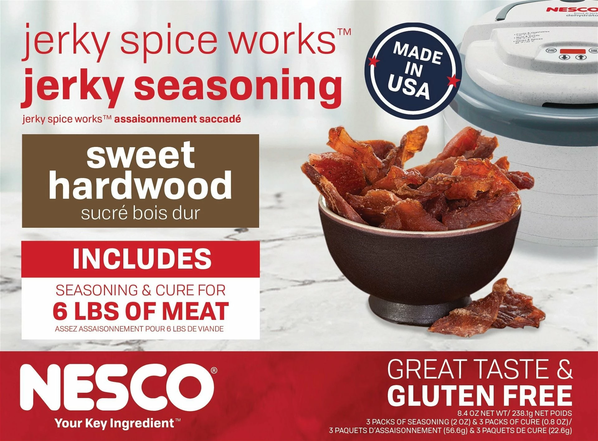 Sweet Hardwood Nesco Jerky Seasoning is gluten-free & proudly made in the USA. Each seasoning & cure packet will make up to 2 lbs of meat with a 3-pack of seasoning capable of making up to 6 lbs of meat.