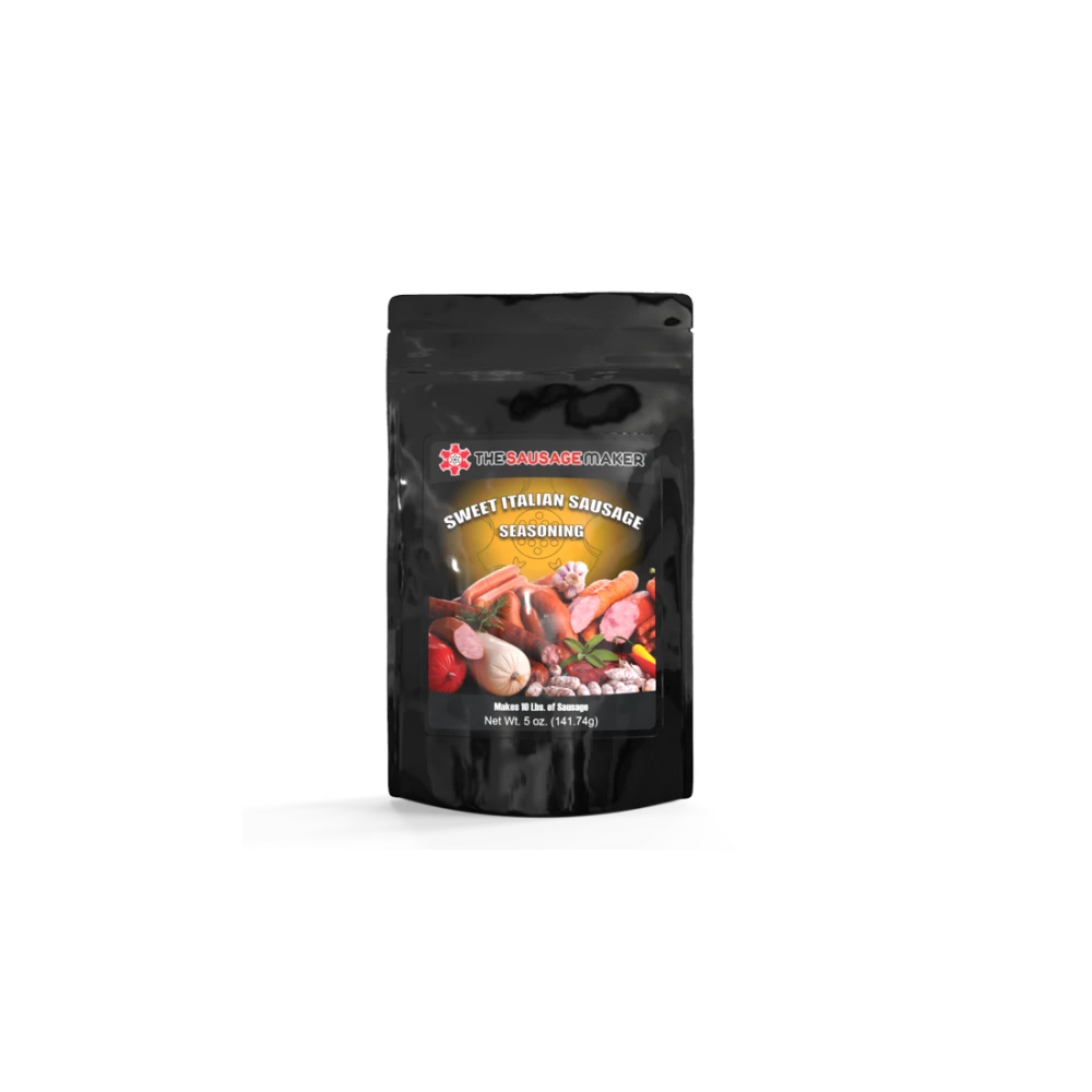 Nothing beats homemade sausage patties or links, especially made with your TSM Machine. But getting the spices right can be a trick, so what would you go with? For traditional Italian sausage, there’s no better way to enjoy a meal with some spice & sweetness than The Sausage Maker 5oz Sweet Italian Sausage Seasoning. This seasoning is an incredible & authentic blend of spices that sets the bar in how sweet Italian sausage should taste. Even if you are working with store-bought ground sausage, it doesn’t hurt to add a lovely dash of this seasoning to your patties. The back of the label shows the recipe needed for homemade sausage in case you need a reference. You can stuff it into sheep or collagen casings, and it seasons up to 10 lbs. of sausage. In pan-frying or grilling sausage right, especially for lunch or dinner, you have to have your own The Sausage Maker 5oz Sweet Italian Sausage Seasoning.