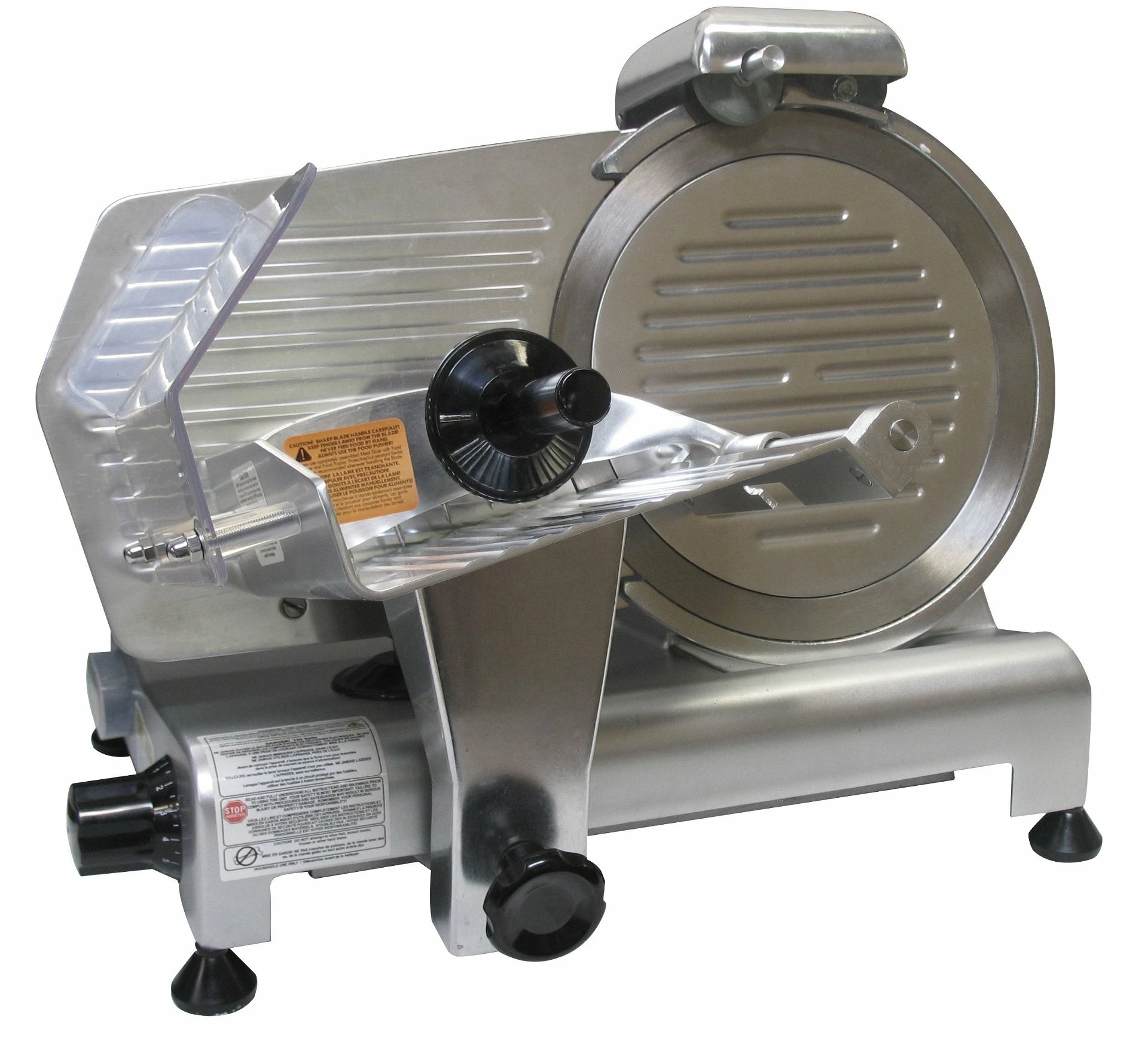 Slice deli meats efficiently with the Weston Pro 1” Meat Slicer. This mean, meat-slicing machine comes with a 0.4 HP (320 watt), belt-driven motor. The stainless steel blade has a 10” diameter and can tackle and slicing job, as it spins at 460 RPM. Never worry about the blade dulling, either, because the slicer comes with a detachable, dual-sided blade sharpener. Adjust the thickness of your slices between paper thin and 1/2″. The gliding carriage offers smooth slicing with the food pusher that secures the food for controlled slicing. The large base in the back will catch the sliced meat as it falls from the blade. No need to worry about the machine moving around either, because the sturdy, solid base comes with suction cup feet for stable slicing. For the best in meat processing, go with Weston!